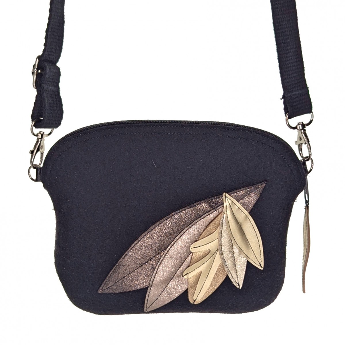 Torbica iz volnenega filca je okrašena z unikatnim šopkom bleščečih usnjenih listov. Oblikovana, da razsvetli tvoj dan in popestri tvoj styling.